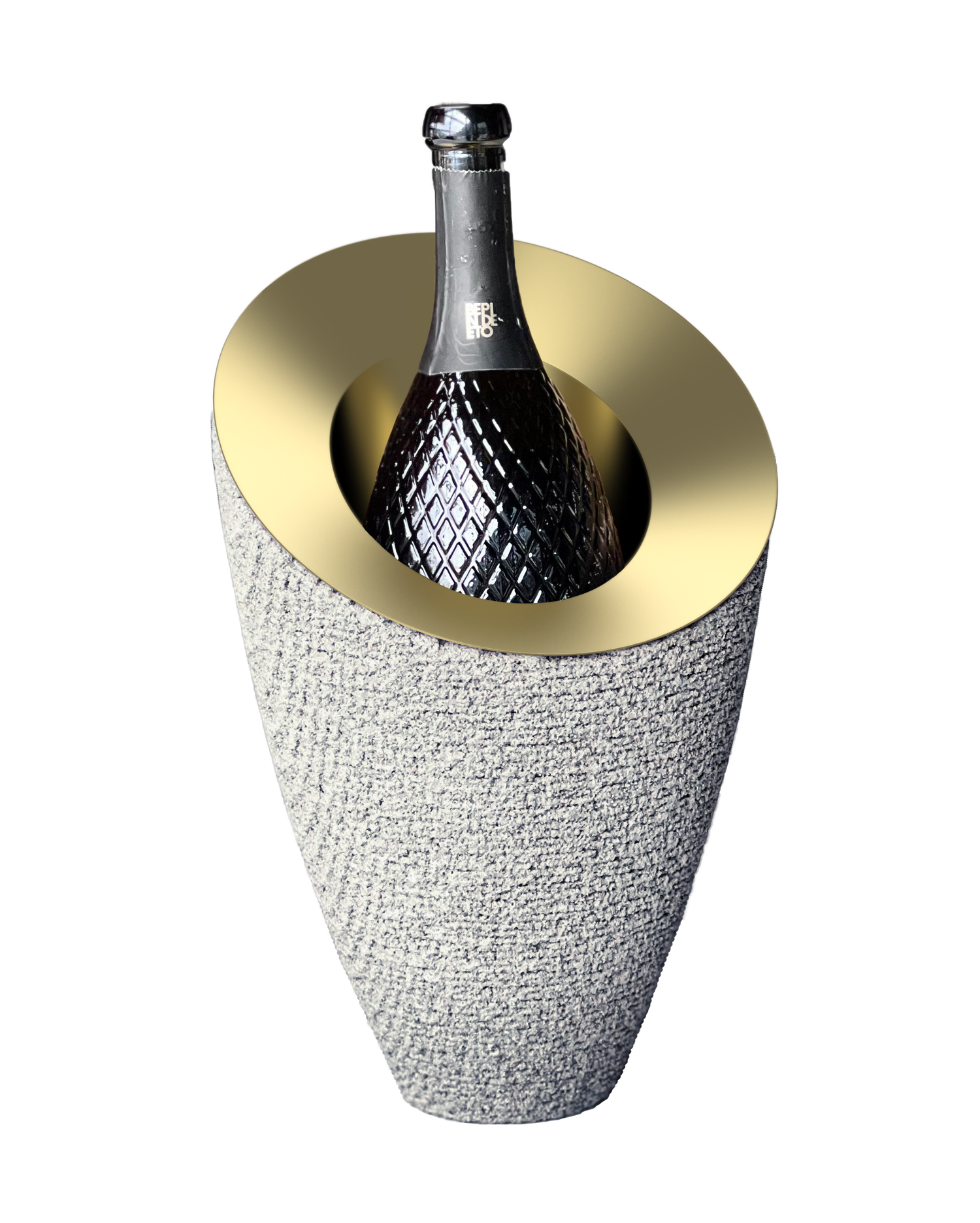 Introducing a cutting-edge Champagne cooler, crafted with precision through 3D printing technology. This innovative cooler features a brass insert, eliminating the need for ice cubes by maintaining the perfect temperature. Manufactured with a smart approach, it ensures no material wastage, making it both efficient and eco-friendly. The outer structure is made from concrete based on recycled glass, blending sustainability with sleek, modern design. Ideal for those who appreciate luxury with a conscience, this Champagne cooler is a testament to the future of sustainable, high-end entertaining.
